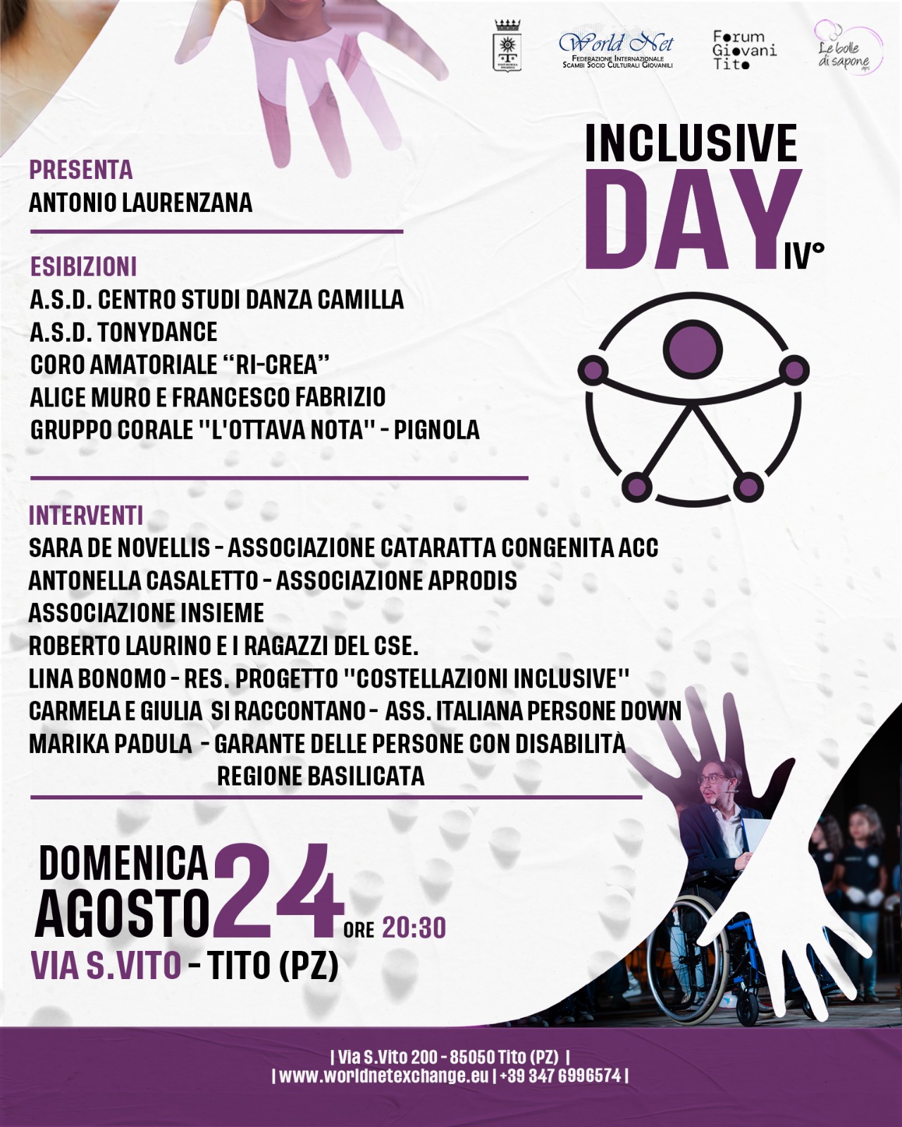 Inclusive Day torna a Tito per la sua 4° edizione. Vi aspettiamo domenica 24 agosto alle 20:30 Presenta: Antonio Laurenzana